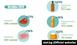 Изменение цен на основные продукты в Кыргызстане по сравнению с октябрем 2020 года. По данным Нацстаткома:
