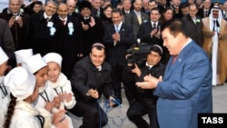 Президент Узбекистана Ислам Каримов танцует на праздновании Дня независимости. Слева от него – премьер-министр Шавкат Мирзиёев. Ташкент, 31 августа 2007 года